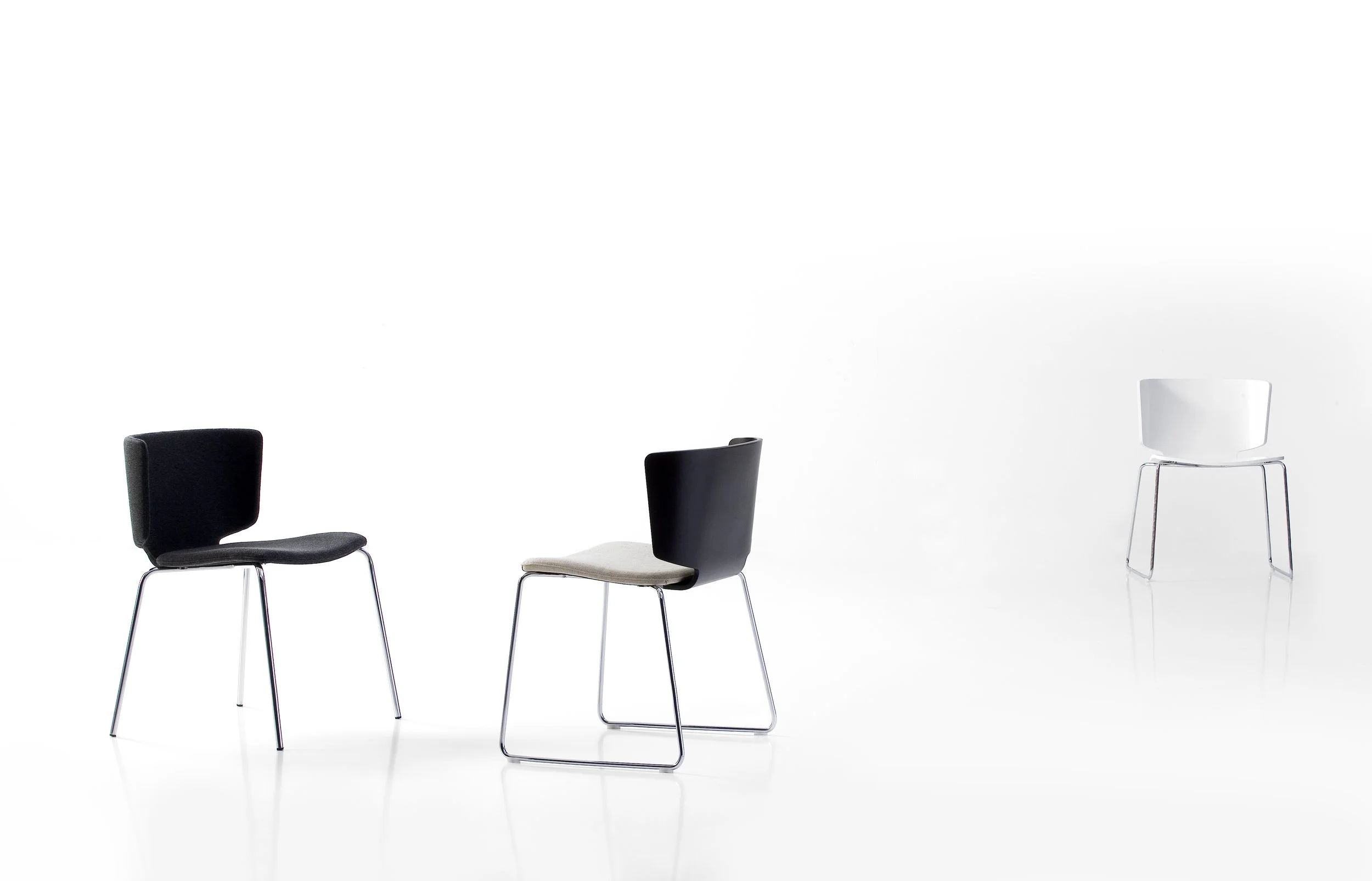 Chair version of the Wrapp series featuring it’s characteristic lateral “wings” which provide arm support and also a sense of containment. The chairs are light and practical yet comfortable and inviting.