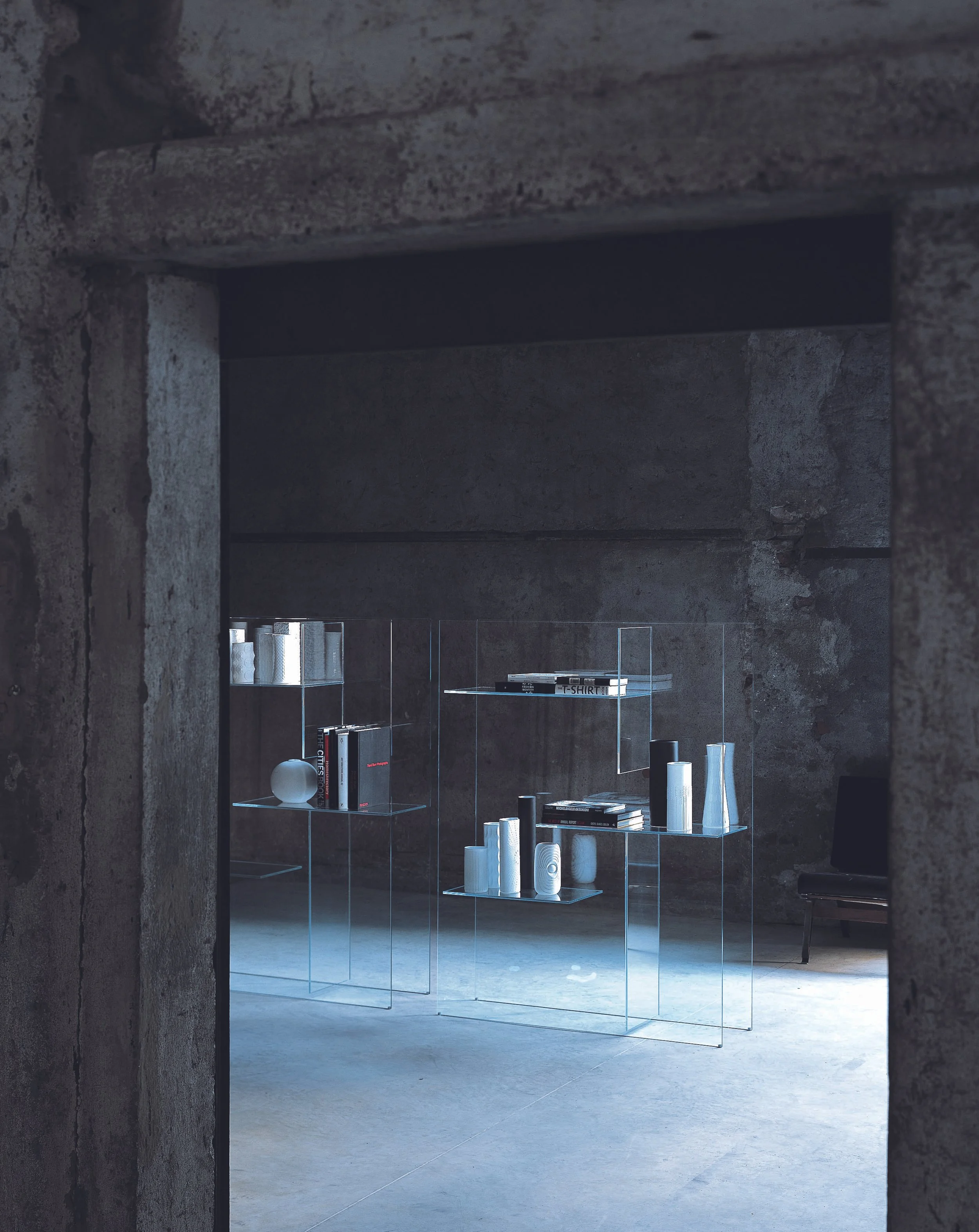 Designed together with Kensaku Oshiro, this elegant shelf unit provides useful storage/ display space while acting as a sculptural room divider. Available in transparent extralight glass or transparent coloured glass.